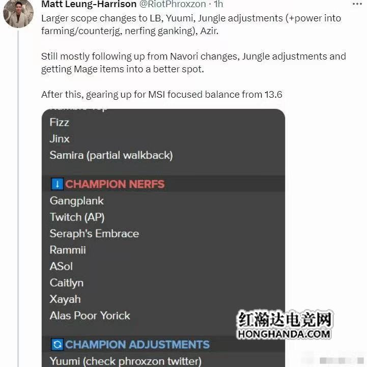 Riot Phroxzon:“妖姬和悠米的大型调整,野区调整(对刷野/反野增加强度,削弱gank),还有沙皇的改动大部分改动为纳沃利迅刃的完善改动,野区的调整,以及让法师装备处于更好的地位。在这之后,我们准备从13.6版本开始专注于为MSI进行平衡。”