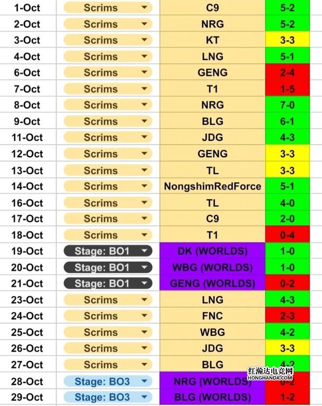 G2经理公布的训练赛战绩如下,从10月1日开始一直到10月29日,训练赛非常多。面对JDG战队训练赛的战绩是7胜6负,算是五五开;面对LNG战绩8胜4负,G2明显优势;面对BLG战绩10胜3负,可以说G2巨大优势;面对WBG战绩4胜2负,也是G2优势。和LPL赛区的4支战队,G2都是在训练赛中拿到了优势。