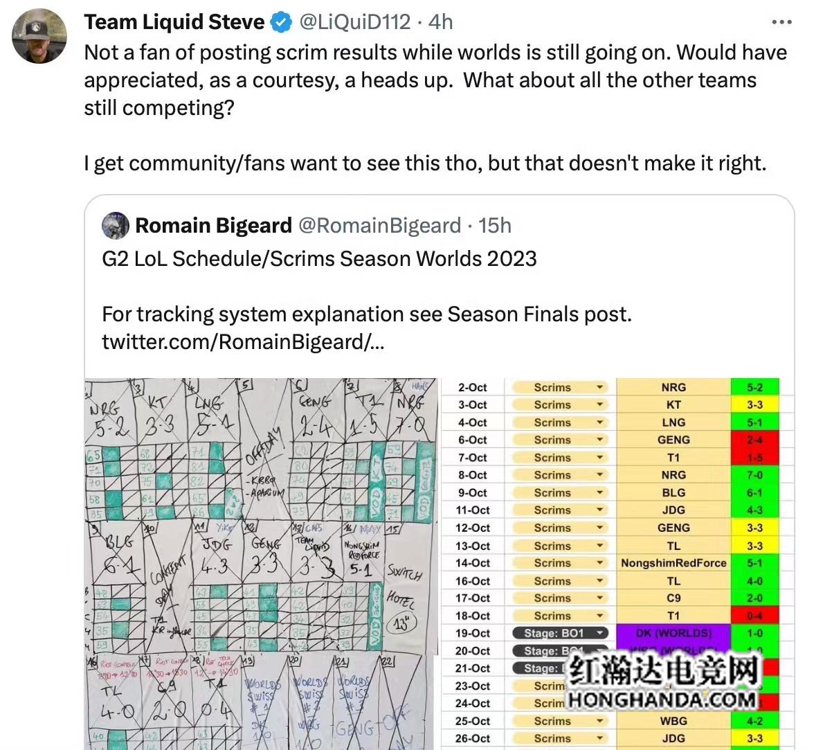 而在公布的训练赛成绩来看,肯定是非常的亮眼的,这也让很多人觉得他们可能还有点想要炫耀的成分。而作为在训练赛数据中几乎一直败给他们的TL,就看不下去了,作为TL的CEO,直接发文说道:不赞同在全球总决赛进行期间公开训练赛成绩。作为礼仪,请提前告知(被公开训练赛成绩的对手),我将不胜感激。那些还在参加全球总决赛的其他队伍怎么想呢?我知道论坛和粉丝想看这个,但并不意味着这是正确的。