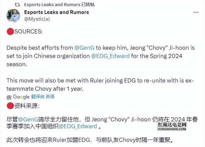 具体爆料内容如下图所示,外网有人爆料尽管GEN想要留住chovy,但是chovy决定将在2024年春季赛加入EDG,同时Ruler也将加入EDG,他和chovy将在一年后再次携手当队友。