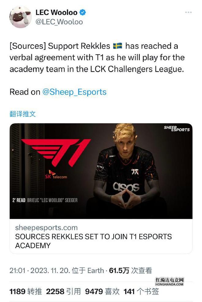 外媒的爆料消息如下图所示,表示Rekkles已经和T1达成了口头协定,他将在效力于LCK次级联赛,加入T1二队。