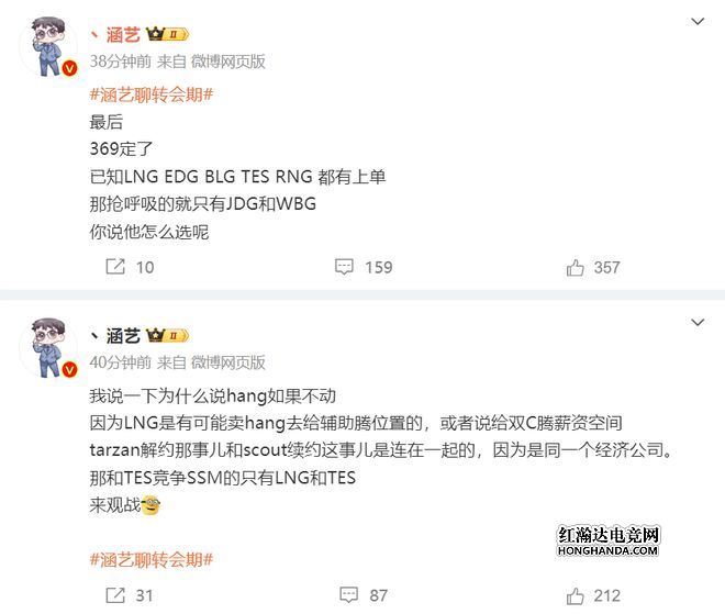接着涵艺爆料:为什么说hang可能留队,因为LNG原本打算卖hang来买新辅助,或者给双C腾薪资空间的,Tarzan解约同时Scout续约,这两件事情都是同一个经纪公司。目前想要Ming的只有LNG和TES。最后涵艺表示:WBG和JDG在抢breathe。