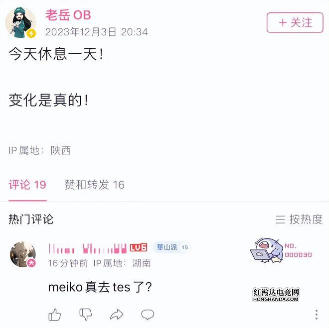 但是Meiko自从出道以来一直在EDG,可以说是EDG的元老选手,也是EDG的绝对核心,他真的会离队吗?很多人对于涵艺的这波爆料并不相信。不过在涵艺爆料没多久后,EDG前青训经理老岳发文表示:直播休息一天,变化是真的!因为这个时间点太过于敏感,所以在评论区很多人在评论区都在询问老岳:是不是在暗示meiko真要去TES了?