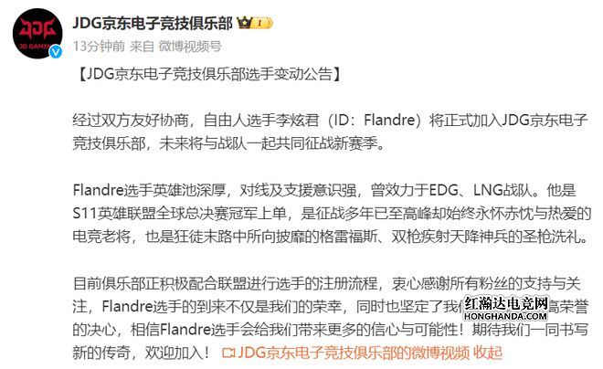 首先是JDG官宣了前EDG上单圣枪哥加入的消息。并且认可了圣枪哥的英雄池,对线能力和支援能力,他曾经是世界冠军上单。最后就是表示圣枪哥的加入是JDG的荣幸,会一起追逐更高的荣誉,带来更多的可能性。