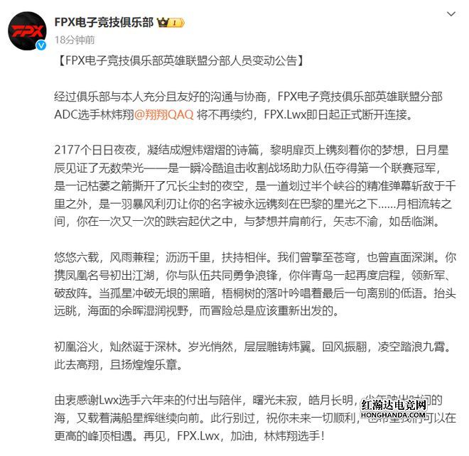 除了JDG之外,FPX也发布了官宣,FPX官宣lwx断开连接。并且在官宣文中表示,一起相处了2177个日夜,认可LWX在FPX的而表现,为FPX拿到了不少的荣誉,最后就是感谢Lwx六年的付出和陪伴,祝福他未来一切顺利。