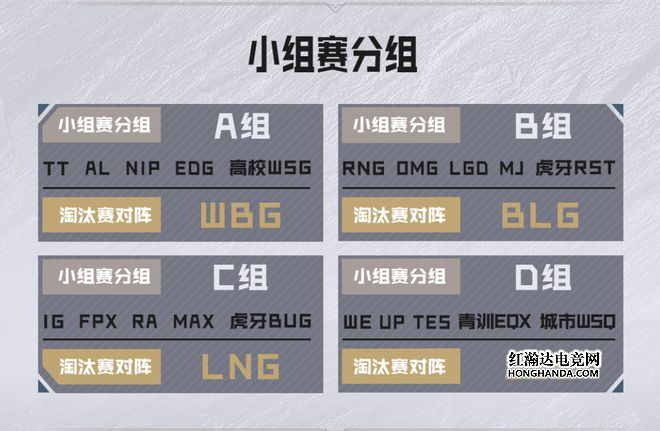首先是分组,WBG、JDG、BLG和LNG因为打进了S13全球总决赛,所以自动晋级到8强,那么剩下的13支LPL战队再加上7支其他参赛战队将被分成4个小组,每个小组5支战队。A组是NIP、EDG、TT、AL和WSG,晋级的战队将在8强对决WBG;B组是OMG、RNG、LGD、MJ和RST,晋级的战队将在8强赛对决BLG;C组是IG、FPX、RA、MAX和BUG,晋级的队伍将在8强赛对决LNG;D组是TES、WE、UP、EOX和WSQ,晋级的队伍将在8强赛对决JDG。