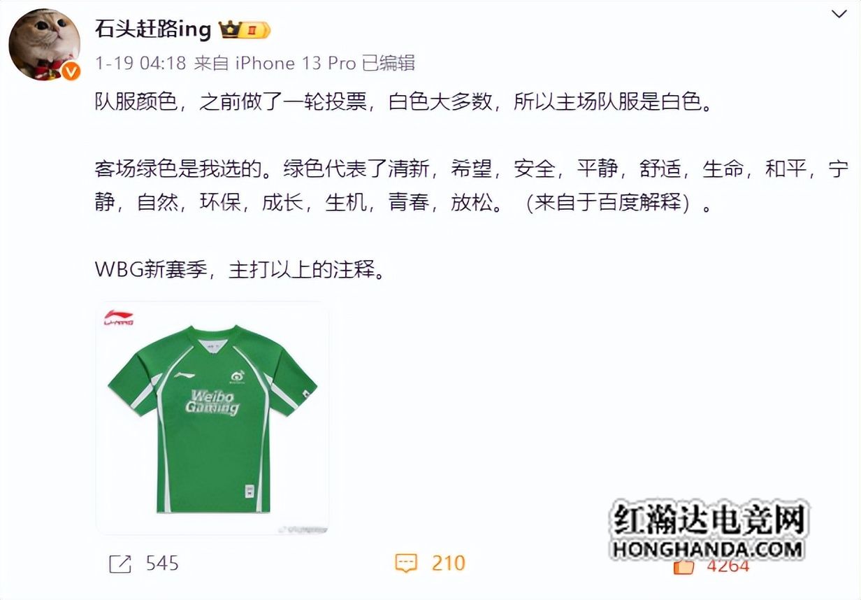 其实此前石头赶路也做出过回应,他表示绿色队服是自己选的,代表清新,希望,安全,平静,舒适,生命,和平,宁静,自然,环保,成长,生机,青春,放松。