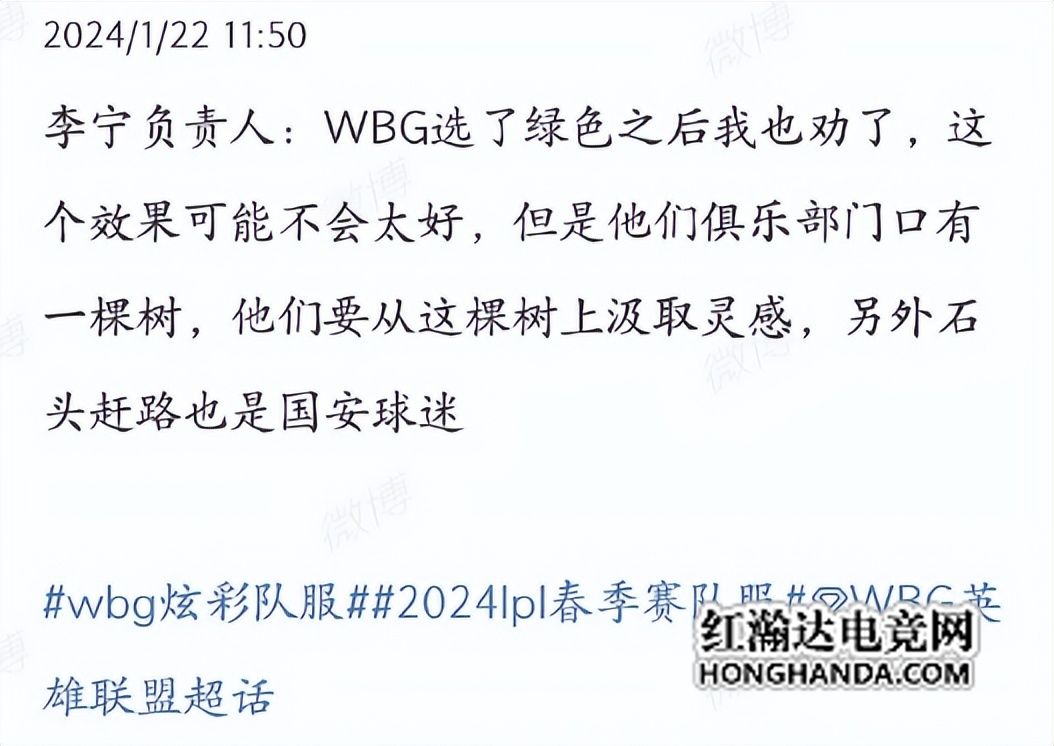 而就在LPL的赛前发布会中,设计队服的李宁负责人表示,WBG选绿色队服时有劝过WBG老板,但是他们俱乐部门前有一棵树,从那里汲取了灵感,同时WBG老板石头赶路也是国安球迷!