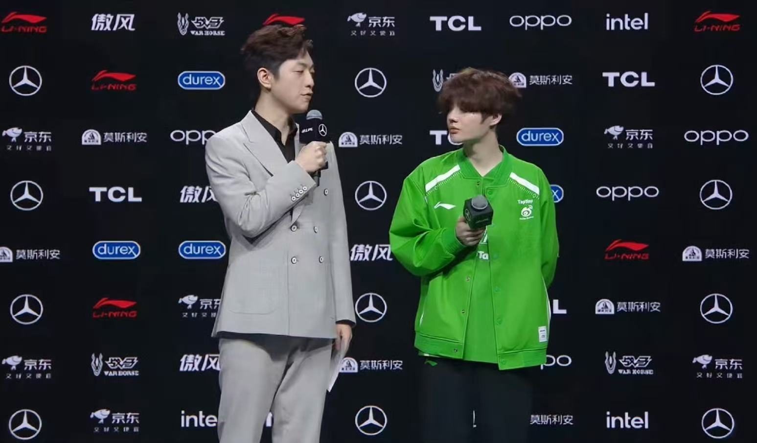 首先对于第一小局的失利,他说道:第一把感觉在团战配合上做的不是很好,导致有很多可以抓住的机会没有抓住。而对于之后的碾压胜利,他也说道:因为相对于版本强势的英雄之外,教练可能比较在意对方打野更擅长什么英雄,所以就针对他们的英雄做了一个BP吧。最后他也说道:今天赢下来还是比较不容易吧,希望我们能凭着这个感觉,在接下来的比赛里表现的越来越好。