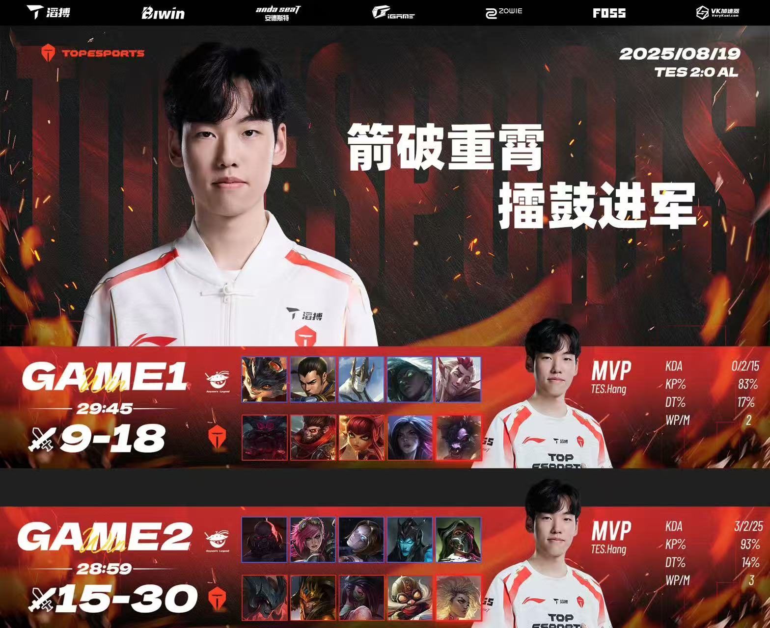 对于这场轻松零封的胜利,369说道:最近大家状态都挺好的,能够想到这场比赛2-0结束吧。而对于这场比赛下路队友们的发挥,他也赞叹说道:今天看了下他们的塔下反杀,还是非常细腻的,两个人都挺细腻的。希望他们俩越打越好,然后一起拿个好成绩吧。而作为败方这边,Tarzan也表示到:这两把都是前期没有处理好吧,之后继续把前期做好。