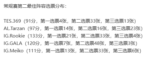 从战队维度看,最佳阵容呈现明显的"两极分化":登峰组前二的TES与IG实现全员入选(一阵3人+二阵1人+三阵1人、一阵1人+二阵3人+三阵1人),而第三名BLG仅有中下辅三人入围,第四名AL则靠圣枪哥与打野Tarzan撑起门面。