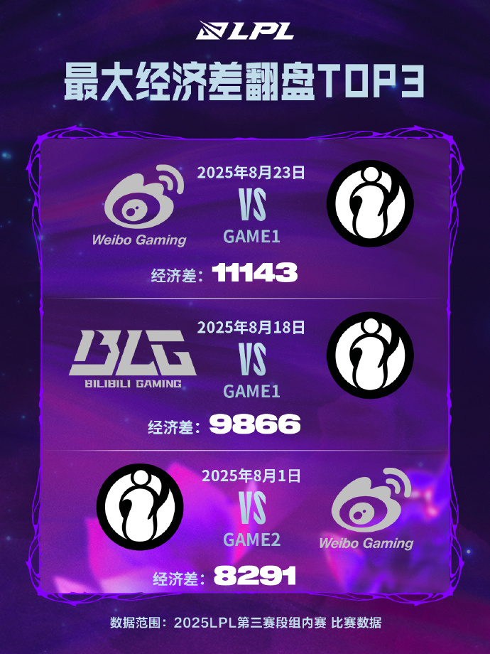 如果说流量数据是IG的表象,那么LPL官方发布的本赛季"最大经济差翻盘榜"则揭示了其内核——IG包揽前三,成为"逆天改命"的代名词。其中两场是对阵WBG完成的,一场是对阵BLG的。这些看似"离谱"的翻盘,实则是IG独特战术风格的缩影——极致的进攻欲望、天马行空的团战配合,以及永不言弃的电竞精神。正如网友调侃:"看IG比赛,前20分钟想关直播,后10分钟跪着看回放。"这种跌宕起伏的观赛体验,让IG成为LPL的"节目效果保证",甚至衍生出"IG比赛必备速效救心丸"的观众文化。