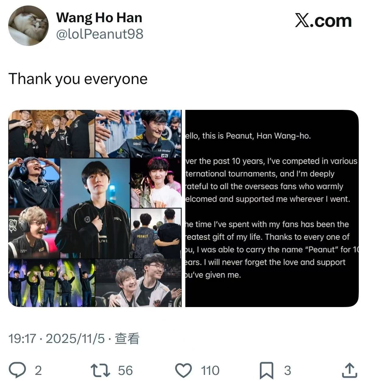 看到Peanut如此的发文,真的感慨万千,又一位传奇选手告别赛场了~