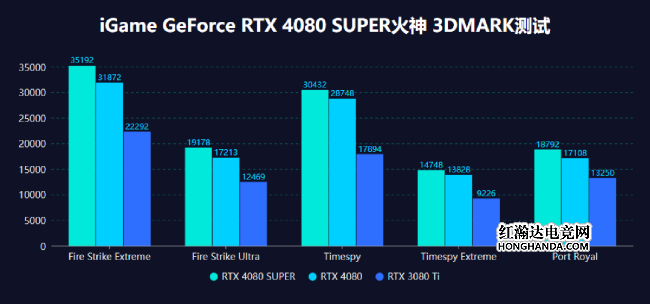 在3DMARK的测试环节中,Time Spy系列的两个场景中,iGame GeForce RTX 4080 SUPER领先4080约6%以上,光线追踪性能更是高出RTX 3080 Ti多达42%,更强的RT核心带来了显著的性能提升,这对于提升游戏内的光线追踪效果意义重大。