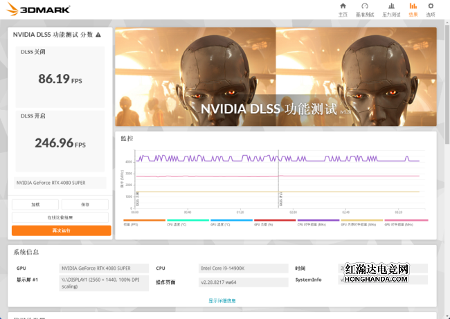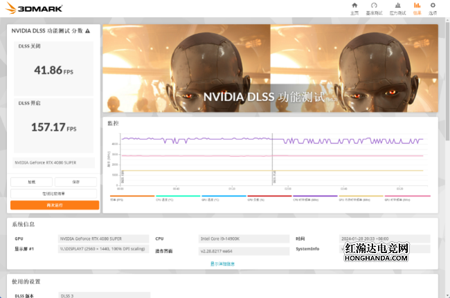 在3DMARK DLSS 2K分辨率测试中,关闭DLSS的平均帧率为86.19,开启之后平均帧率来到了246.96FPS,提升幅度达到186%!4K分辨率下,关闭DLSS的平均帧率为41.86FPS,开启DLSS之后帧率为157.17帧,提升275%!