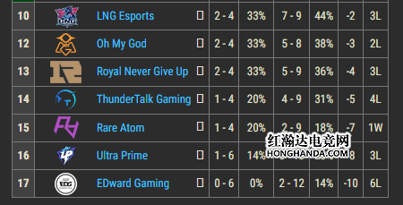 RNG目前2-4的战绩,与LNG、OMG和LGD胜负并列,跌至LPL第十三名。在更换了下路AD之后,RNG依旧是没有起色,并没有结束连败。