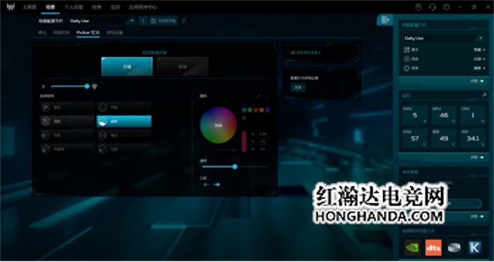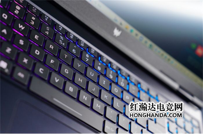 C面采用了RGB炫彩键盘,包含了全尺寸方向键和数字小键盘,键盘按键回弹反馈灵敏,手感还不错,RGB灯效支持多种自定义的设置,可根据个人喜好自行选择和调整配色。