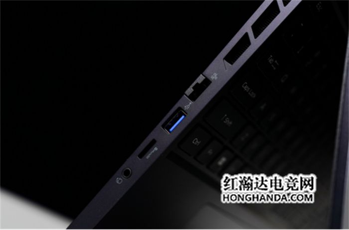 左侧是一个USB 3.2 Gen1接口、一个耳机麦克风接口、一个RJ45网卡接口、一个Micro SD读卡器插槽。