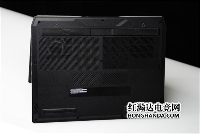 笔记本D面虽然采用了大面积镂空设计,但是依旧十分坚固,四个硅胶长条型脚垫可以很好的托起机身,同时保证空气顺畅流动,提升整机的散热效率。