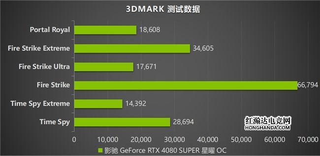 影驰 GeForce RTX 4080 SUPER星曜 OC在3DMARK测试中,显卡分数为28694分。3DMark Fire Strike DX11测试的分数也达到了66794,在3DMark Portal Royal光追测试的成绩则为18608。总体分数表现算的上是优异,即便在运行3A光追游戏大作时,也能够给与用户们一个优异的性能体现。