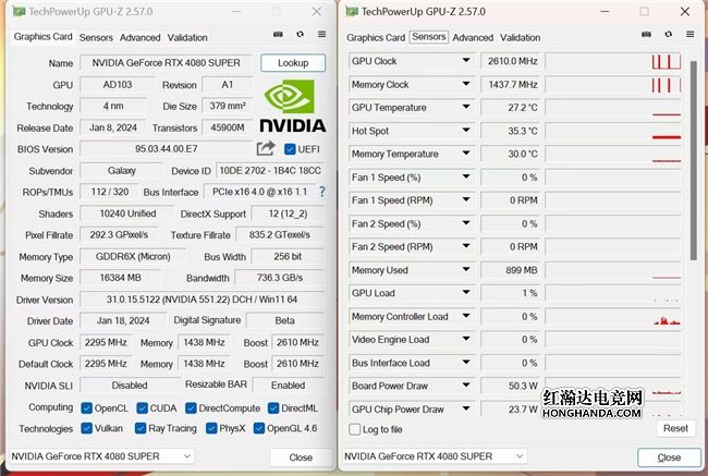 以上为影驰 GeForce RTX 4080 SUPER 星曜 OC 的基本参数。从GPU-Z的数据中可以看到影驰GeForce RTX 4080 SUPER 星曜 OC 的待机维度为27.2°C,功耗为23.7W。这里要注意,。影驰GeForce RTX 4080 SUPER 星曜 OC的功耗为 320W(MAX 450W),推荐用户们搭配850W及以上功率电源使用。