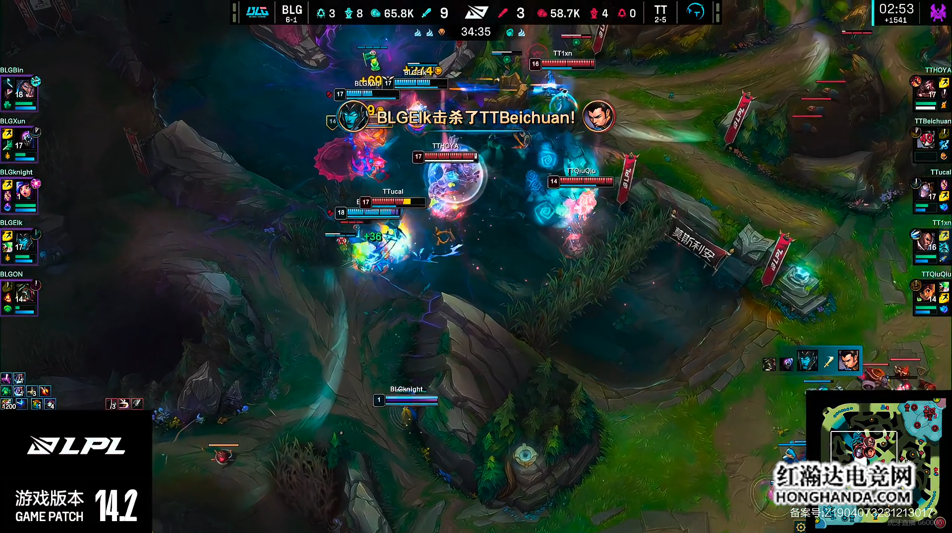 BLG下路两人在开局2分钟越塔失败,被TT下路组击杀。BLG贾克斯随后Gank下路抓死了Qiuqiu的明烛,随后的小龙团knight妮蔻大到三人打赢小龙团,BLG前期几乎三线优势。