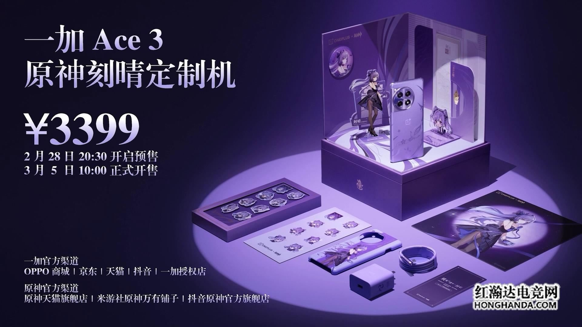 一加 Ace 3 原神刻晴定制机于 2 月 28 日晚上 8 点 30 分开启预售; 3 月 5 日上午 10 点 OPPO、京东、天猫、抖音商城的一加官方旗舰店以及原神天猫旗舰店、抖音原神官方旗舰店及米游社万有铺子正式开售,16GB+512GB 售价 3399 元。