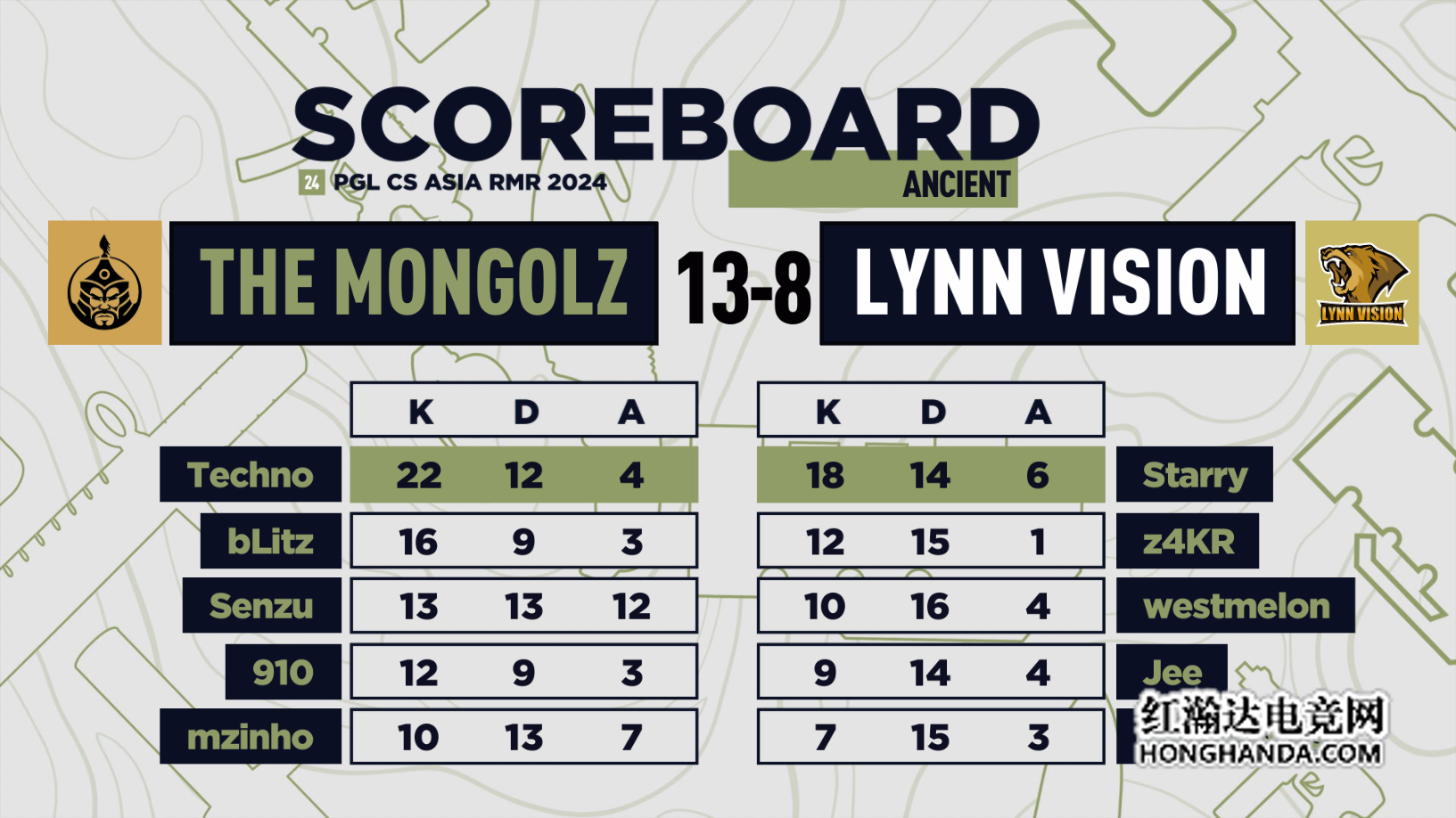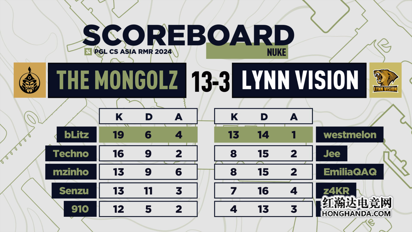 nuke上LVG快攻A区拿到手枪局2-0开局,长枪局Jee再次督战队友,蒙古队布下天罗地网连拿4分反超。LVG在ECO局下K1、管道夹B,Starry双杀扳回1分。然而随后Jee输掉1V1残局,又没补上管道的Techno,LVG痛失两局。此时蒙古队全员发挥,senzu都敢前压匪厅上外场3楼抄后,蒙古队一波9-1结束上半场。换边后蒙古队快提连接拿下手枪局,连下4局获得胜利。