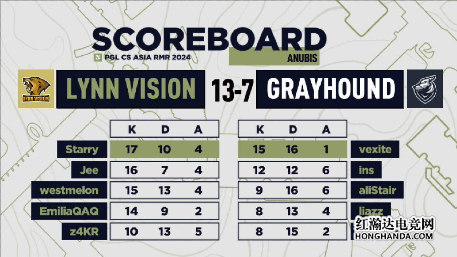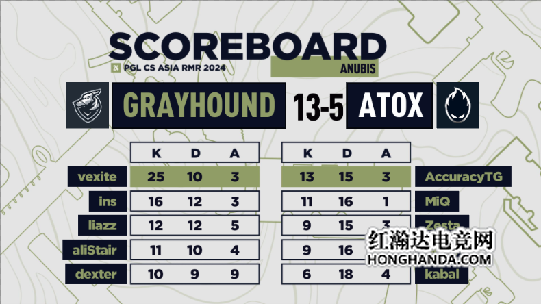 决胜图anubis,kabal双杀拿下手枪局2-0开局,而灰狗竟无甲手枪翻盘连追3分反超。两队开始焦灼,Zesta在B外精准定位,但灰狗的防守更为稳固,Liazz、INS轮番发挥半场7-5领先。换边Vexite暴力突破赢得手枪局掀起进攻狂潮,Vexite黑屋单人3杀破B,灰狗一波5-0终结比赛。