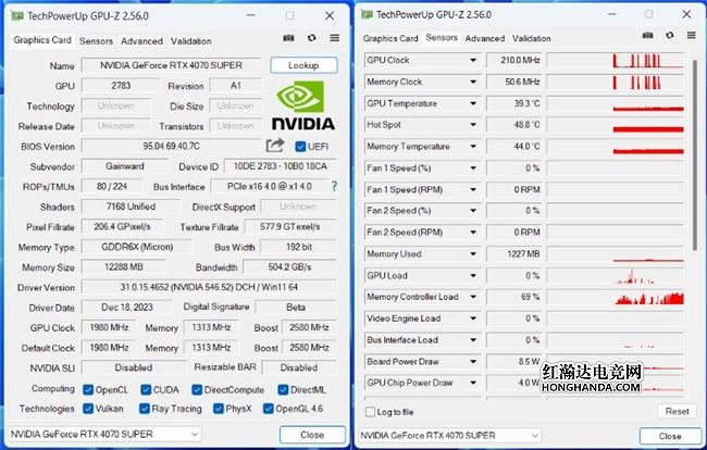 接下来,让我们了解GeForce RTX 4070 SUPER 星极皓月 OC显卡的基本参数,借助GPU-Z这款工具,我们得以了解该显卡待机时的温度为39.3度,功耗仅为8.5W,显示出其卓越的能耗比。这款显卡的TGP功耗仅220W,即便在满载运行时,整体功耗也表现得相当平衡,性能更是出类拔萃。在搭建整机时,官方建议搭配一款600W以上的电源配置,以确保显卡发挥出最佳性能。