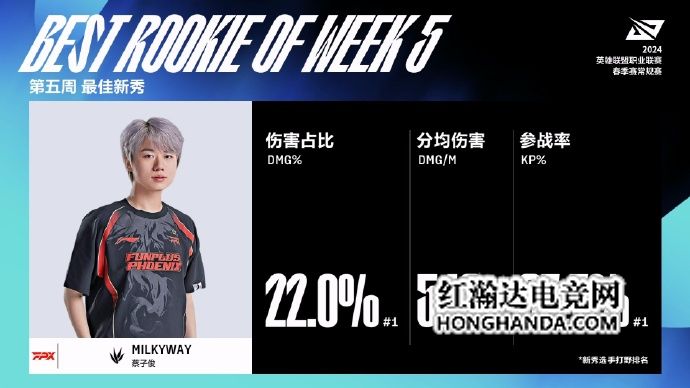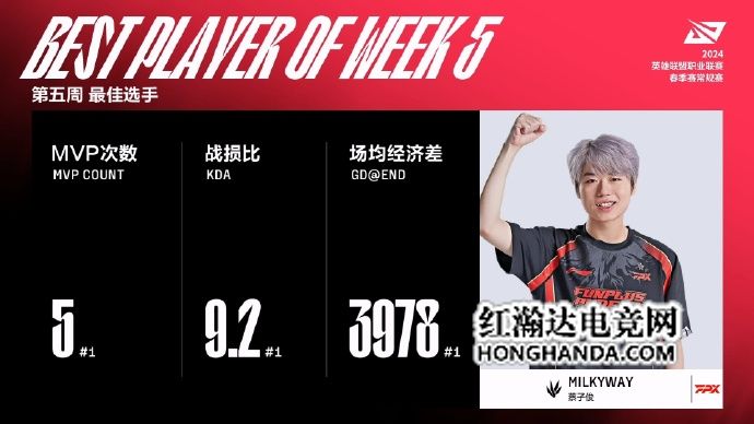 FPX的打野milkyway在第五周的比赛里最为亮眼的打野选手之一,在第五周的比赛里,FPX.milkyway带领着队伍击败了头部战队NIP与TES。“银河专打银河战舰”这是网友们给到他的评价,FPX.milkyway也不负众望拿下了第五周的最佳打野、新秀以及第五周的MVP。