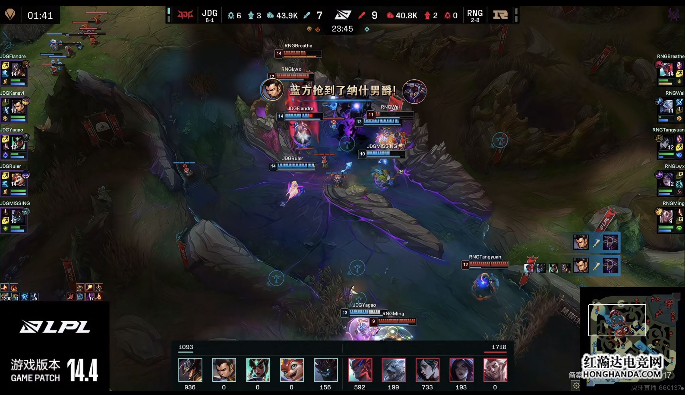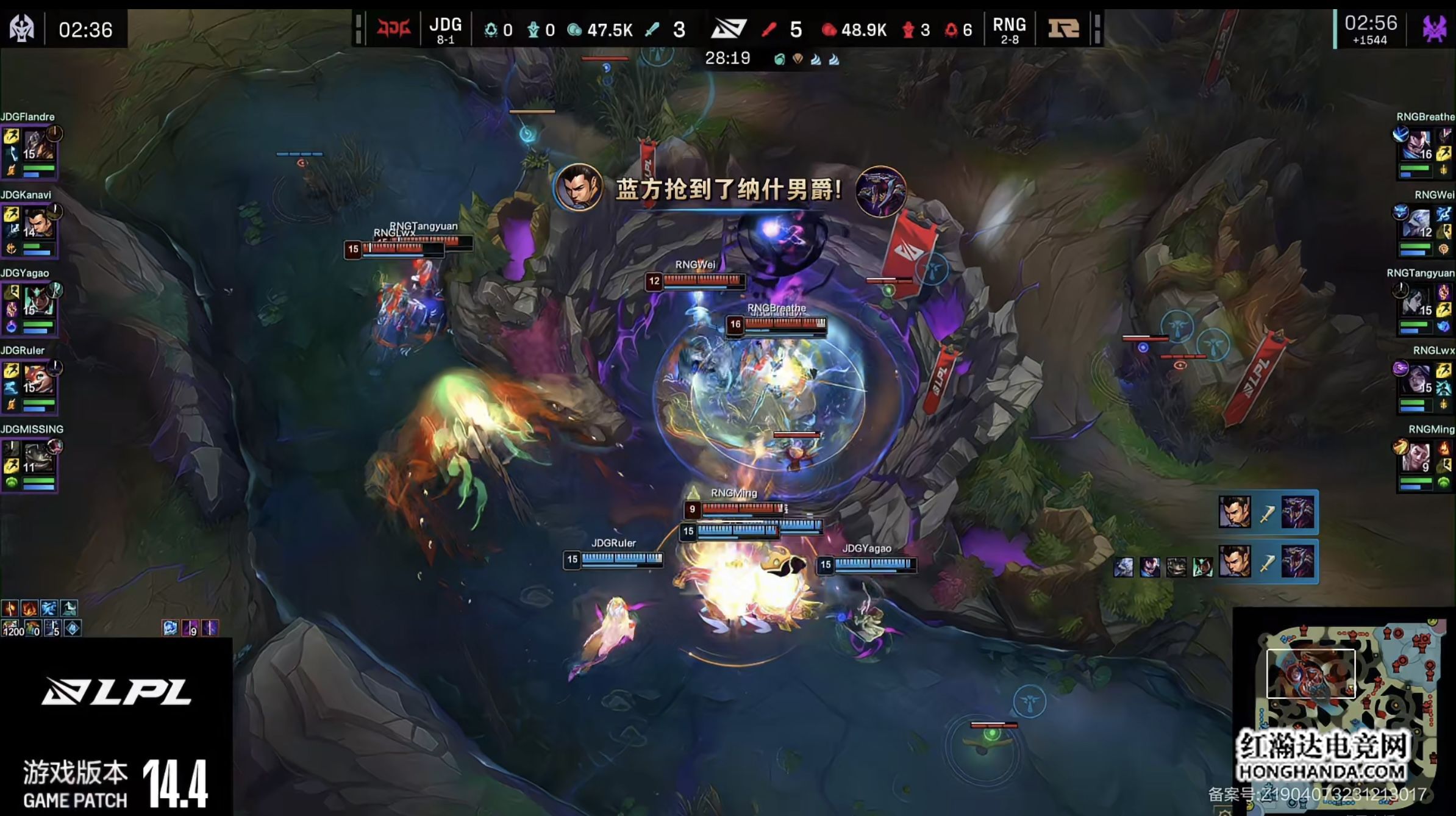 中期JDG的团战拉扯与输出,将RNG慢慢拉扯致死,接手RNG的小龙,Kanavi赵信又在RNG手中抢下大龙。此时JDG士气正盛将RNG团灭,推掉RNG中路高地。