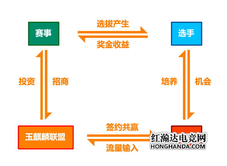 玉麒麟电竞联盟的模式,可以理解为一个简单的联盟到赛事再到选手的逻辑闭环。