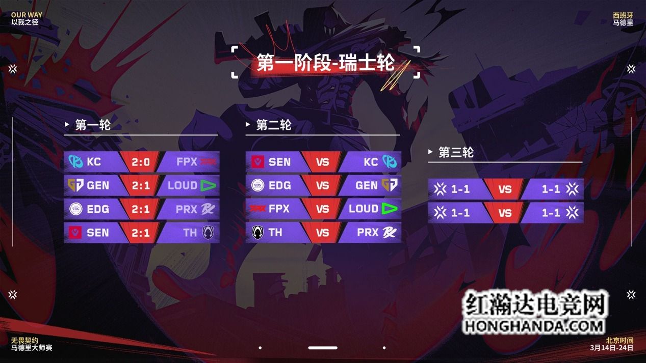 目前,马德里大师赛的瑞士轮阶段仍在火热进行中。瑞士轮阶段的比赛将持续至北京时间3月18日,后续从瑞士轮阶段产生的四强队伍,将晋级至北京时间3月21日至3月25日的淘汰赛阶段,角逐最终的马德里大师赛冠军。
