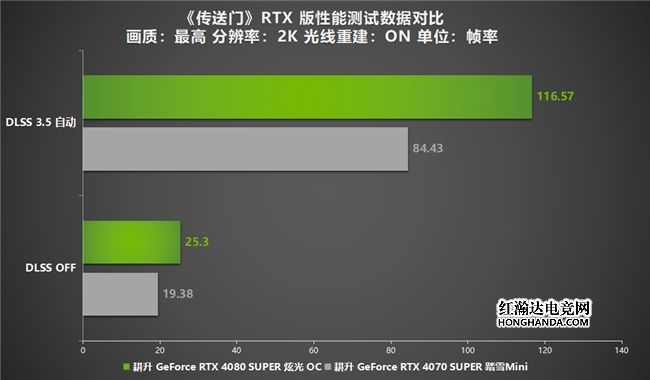 接着是2K分辨率的测试。在关闭DLSS 3.5的情况下,两款显卡的平均帧数进一步降低,来到19.38帧和25.3帧。开启DLSS 3.5后,整体呈现出流畅的水平,耕升 GeForce RTX 4070 SUPER 踏雪Mini的帧率能稳定维持在平均84.43帧。而耕升 GeForce RTX 4080 SUPER 炫光 OC依旧超过平均100帧,能够达到平均116.57帧。