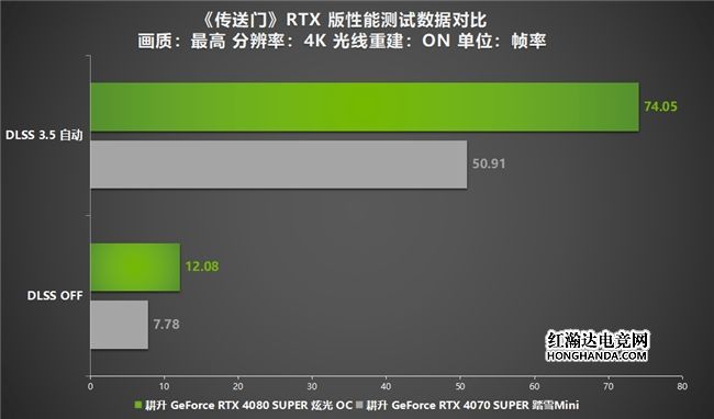 最后是4K分辨率测试,可以看到耕升 GeForce RTX 4070 SUPER 踏雪Mini在开启DLSS 3.5后,能达到平均50.91帧,无法保持游戏的全程流畅。而耕升 GeForce RTX 4080 SUPER 炫光 OC则不负它4K显卡的标志,保持在了平均74.05帧,能够实现游戏的流畅运行。