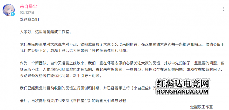 已知目前鹰角网络旗下的工作室有很多,都是分管不同制作的,峘行山(终末地),觉醒波(来自星尘),一拾山(服装),朝陇山(产品周边),重力井(动画)等。像《来自星尘》游戏工作室从凌晨刚上线到晚上11点就发布公告紧急优化,从发现问题到响应问题的速度上来说,官方的态度也算是很诚恳和负责了。