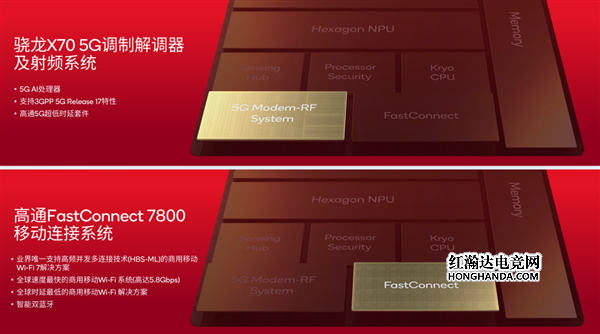 这颗芯片搭载的调制解调器及射频系统,也就是我们俗称的 “ 基带 ”,是骁龙 X70。