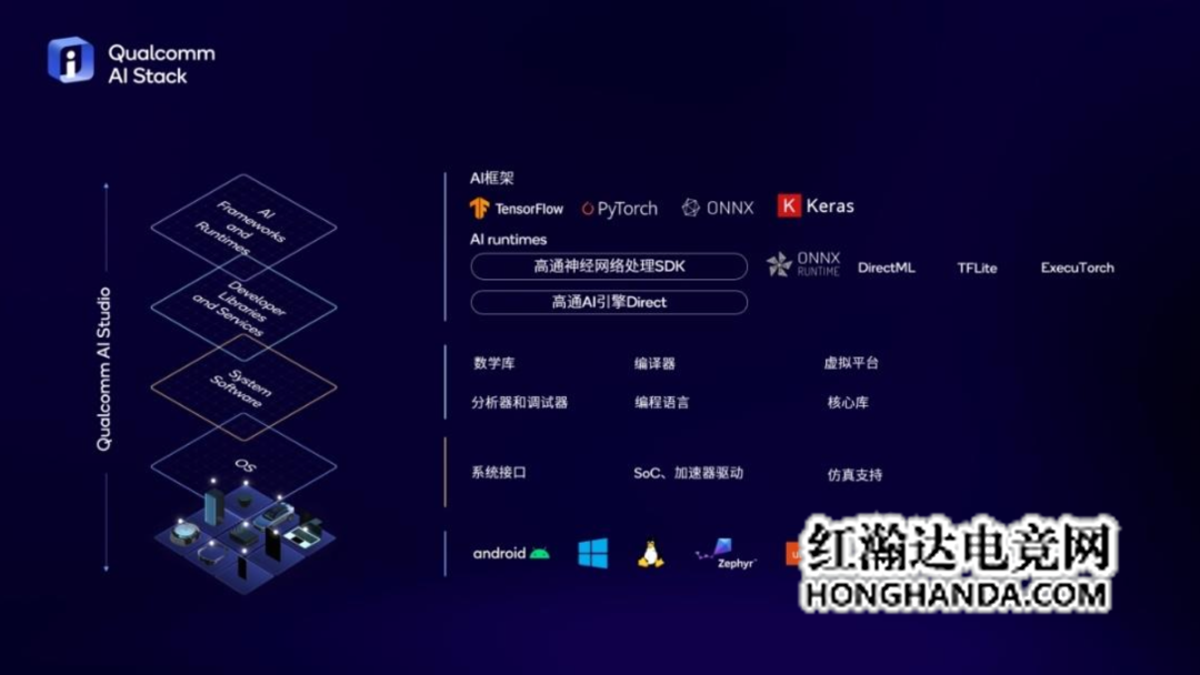 目前高通正在加速 AI 生态的爆发。而这个加速绝不只是在硬件层面:对于开发者而言,高通 AI Stack 和 AI Hub 的推出也极大地降低了 AI 开发的门槛。这两个功能强大的 AI 开放平台,不仅集成了自然语言处理、语音识别、计算机视觉等多个领域的 AI 能力,也包含了全面优化的生成式 AI 大语言模型库。 开发者不用再把精力消耗在各个设备平台的适配以及繁琐的 AI 性能调度上。开发者可以简单高效地在骁龙和高通平台上进行部署,借助高通 AI Hub 提供统一的开发框架和工具链,通过 NPU 等专用硬件和异构计算架构实现高性能、低功耗的 AI 计算。 简单来说,未来的软件开发者,只需要几行代码就可以玩转 AI 大模型,而不同设备的适配也简单省心,节省了大量时间和工作量,快速灵活地打造自己独特的产品。而手机厂商也能更专注于创造属于 AI 时代的全新的交互方式,同时不必受限于算力、功耗、各个传感器调度协作等问题。