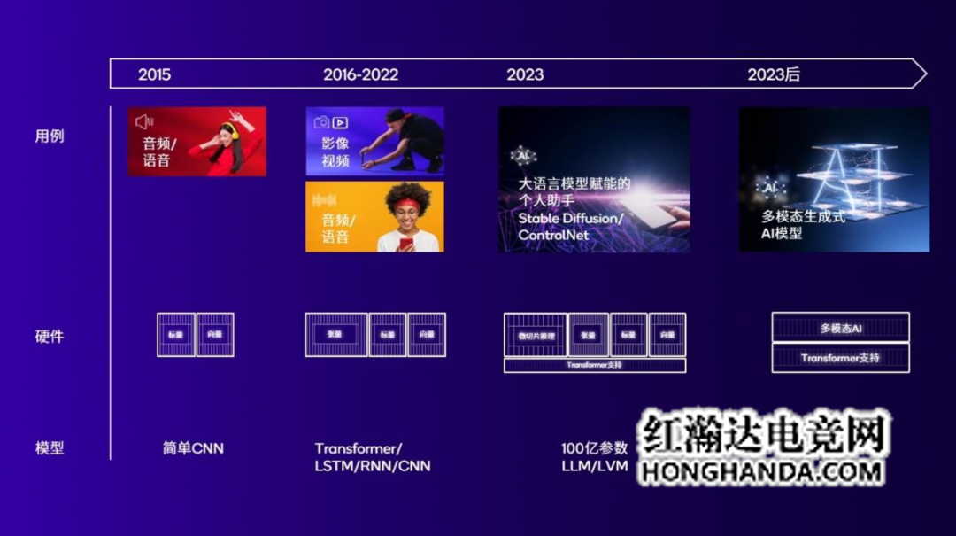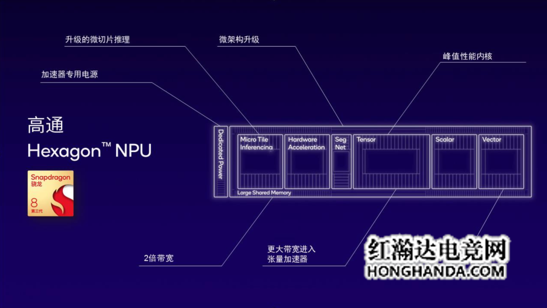 骁龙在 AI 领域的进化,并非简单的算力提升,而是通过各个环节的底层技术革新来实现的:升级的 Hexagon 作为一块专用的 AI 神经网络处理器,在更低功耗的同时大大提升了 AI 运算性能。 骁龙 8 系列还在硬件层面引入了微切片推理(Micro Inferencing)等前沿 AI 技术,在时间轴上对神经网络的不同层次进行切分,让多个切片在同一时刻并行计算,从而确保芯片处理器始终保持高效的运转状态,极大地提高了 AI 推理效率。