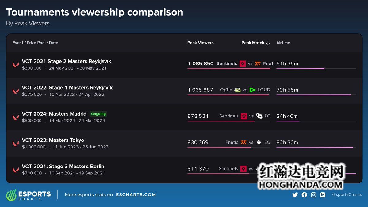 近日,外媒Charts Esports统计了无畏契约马德里大师赛的收视数据。本届马德里大师赛在无畏契约赛事里,最高观看人数数据里排名第三。