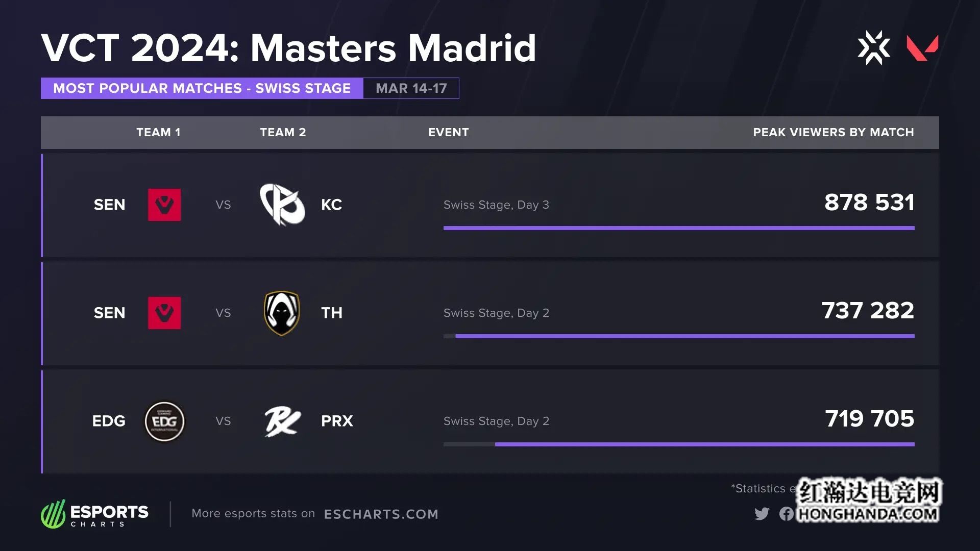 无畏契约马德里大师赛最高同时在线观众人数的比赛,由SEN对阵KC创造,达到了878531。
