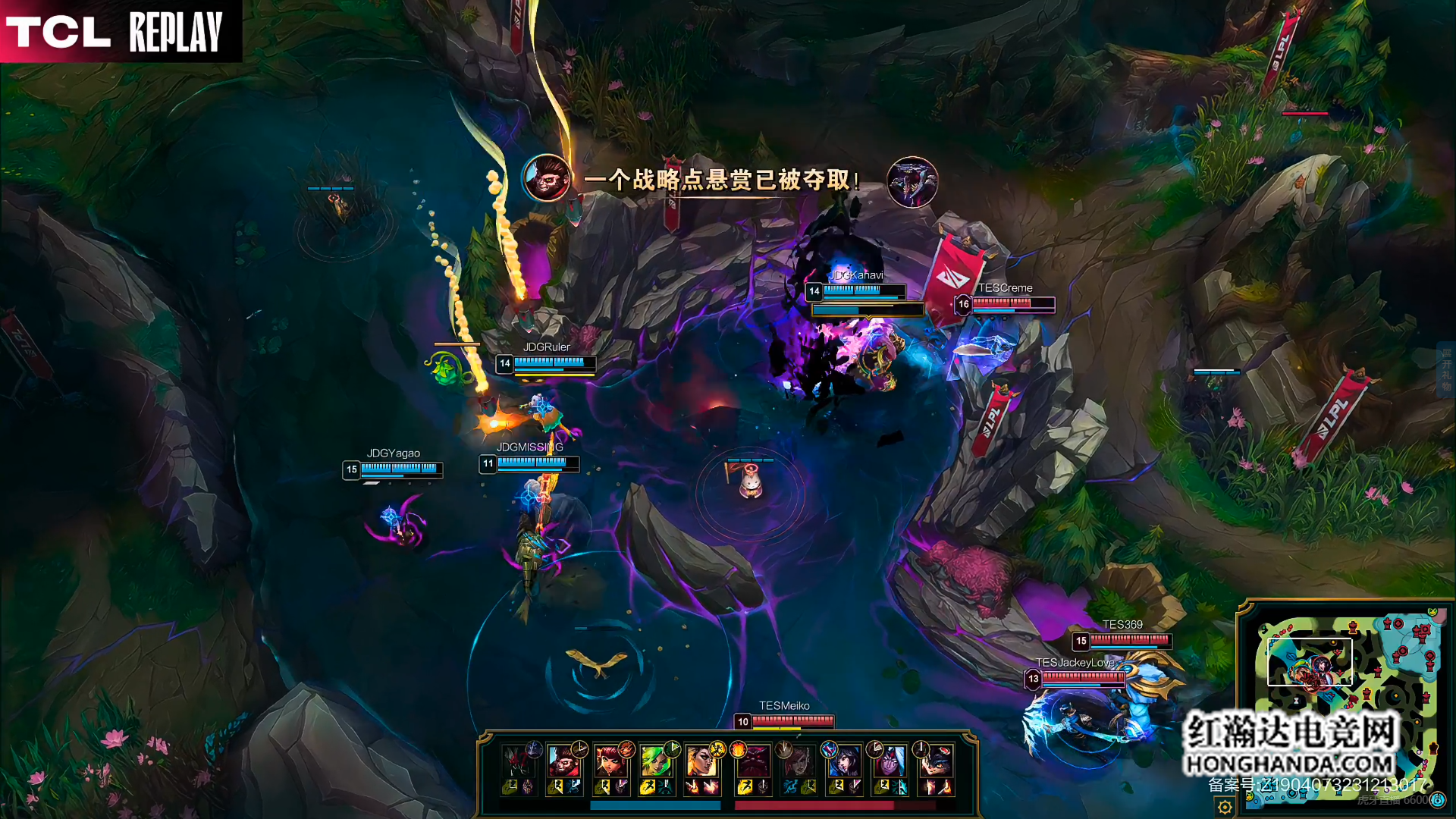 JDG后续控到三条土龙,TES控下大龙冲上高地,369在高地上闪现控人,TES团战大获全胜直接一波赢下第一局比赛的胜利。