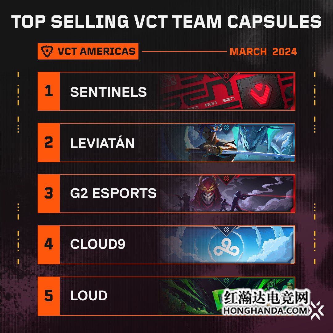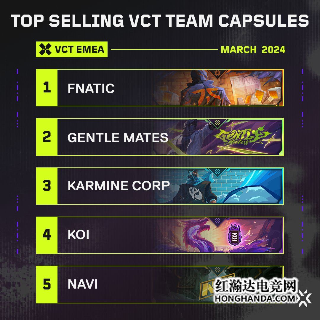 VCT官推晒出了三大赛区的截止到3月的战队礼包TOP 5。