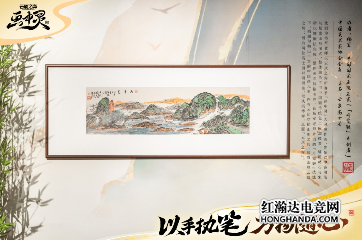 “画中灵”赛季的美术风 格也深受传统水墨画影响,追溯本源,那是来自自然山川中的灵感。以“画中灵”为灵感创作“云泉高士图“的杨军老师(中国国家画院画家“丹霞皴”开创者)也来到了展厅现场。画中先是以中锋用笔勾勒出山形图式,整体颜色主用中国画传统色二绿加藤黄,辅用赭石与朱砂以镶嵌法完成,整体画面鲜艳明亮。在杨军老师开创的“丹霞皴”技法下,画面勾勒出丰富的中国画元素,内有云团穿插山川之间,形成山峰云顶之势;另有两位高士面对面而坐,似执棋博弈,点题“云顶之弈”。