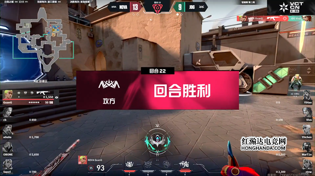 下半场攻守互换,NOVA进一步发挥三先锋体系的威力,通过强势的闪光类技能迅速攻陷B区,顺利拿下开局两分。奖励局JDG拿下以后第16回合在A区浴室三人前压恰好和从A区小道进点的NOVA互换了攻防,JDG绕后成功瓦解了NOVA的攻势,cb的斯凯转点B区下包但依然寡不敌众,双方分差缩小,NOVA交出暂停对战术进行调整。ECO又被追一分以后,NOVA重新组织起对A区的猛攻,频繁的闪光技能加上默契的补枪配合压得JDG无力喘息,率先拿到了赛点。赛点局JDG终于找回了状态,stew通过大招与枪法的配合帮助队伍在悬崖边缘追回一分。第22回合双方激战到最后的1v1,GuanG顺利赢下残局,带领NOVA以13-9赢下图二,双方进入决胜局亚海悬城。