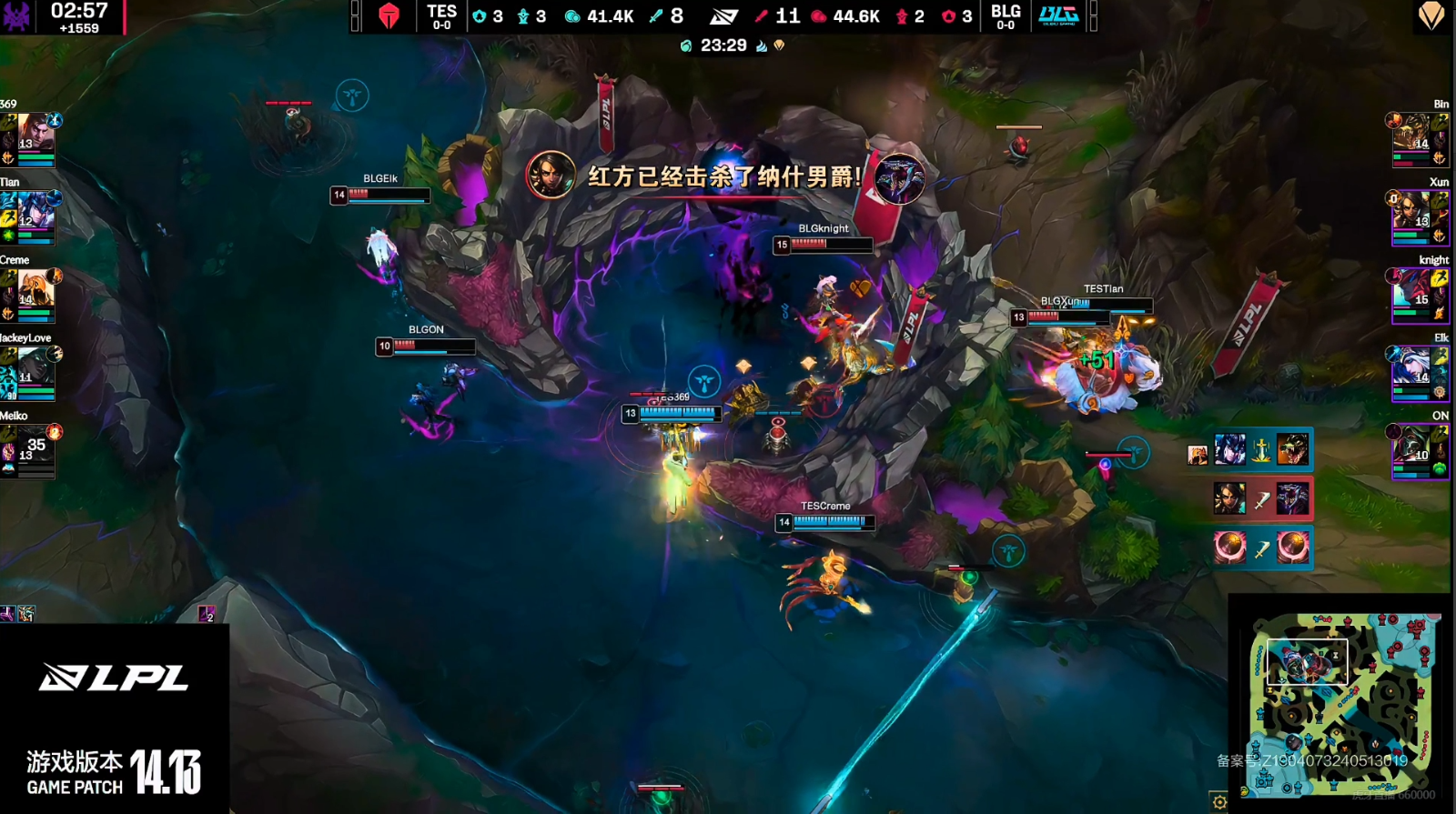 10分钟knight单杀小奶油,随后11分钟上路的支援团战,双方全员到场,BLG将TES野辅击杀。BLG中期开始入侵TES的野区做视野,在18分钟BLG通过团战将TES下路双人击杀。