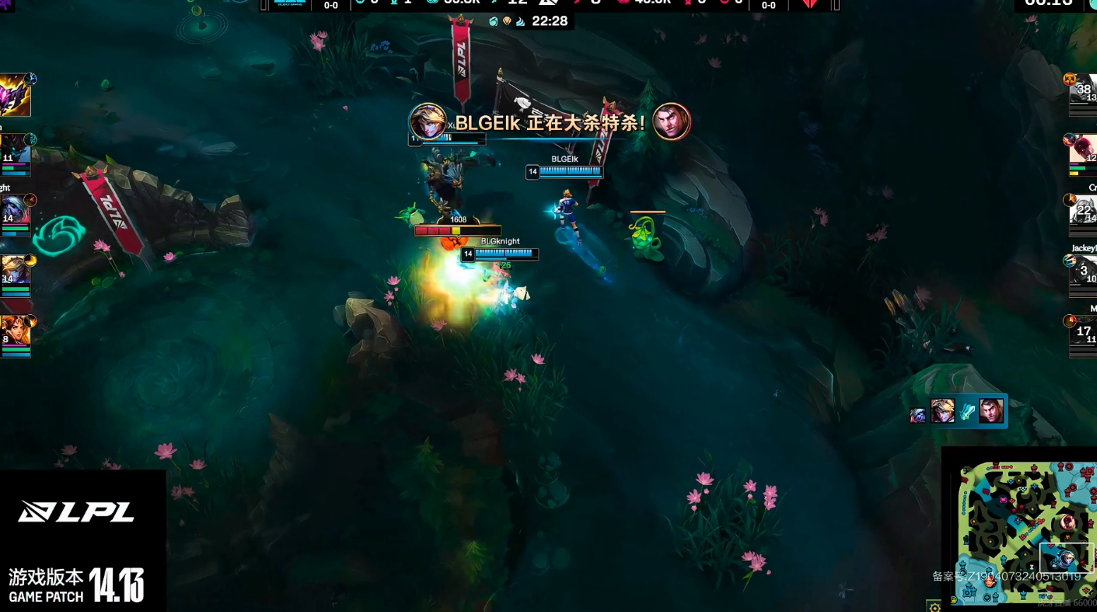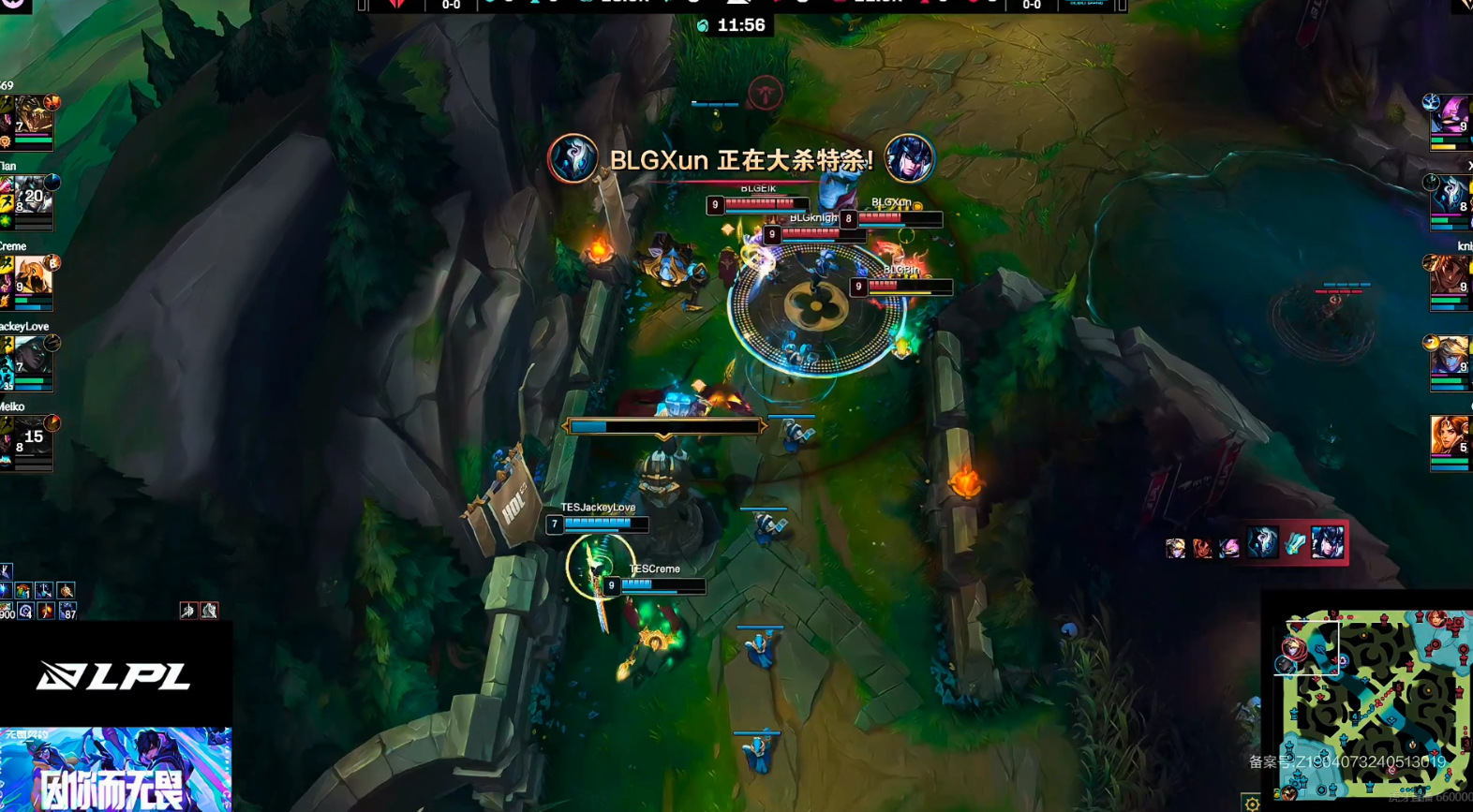 前期Bin的凯南受到TES的针对,但Bin及时稳住,与队伍一同稳住前期的局势。BLG的中下也是优势开始,并且Xun前期控到两条小龙。