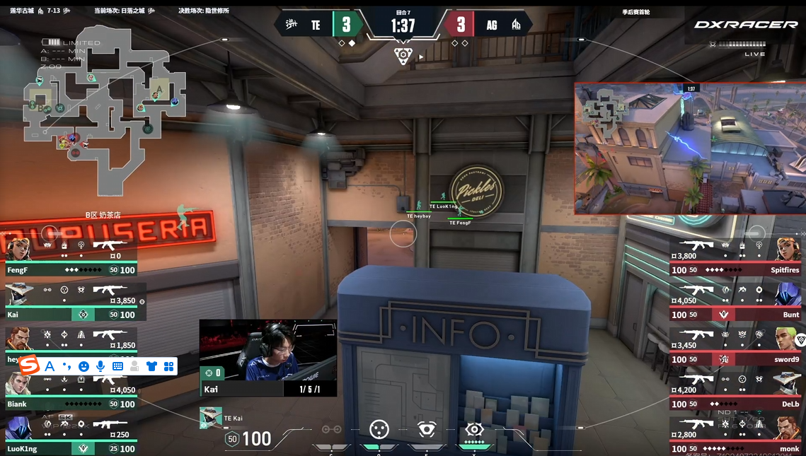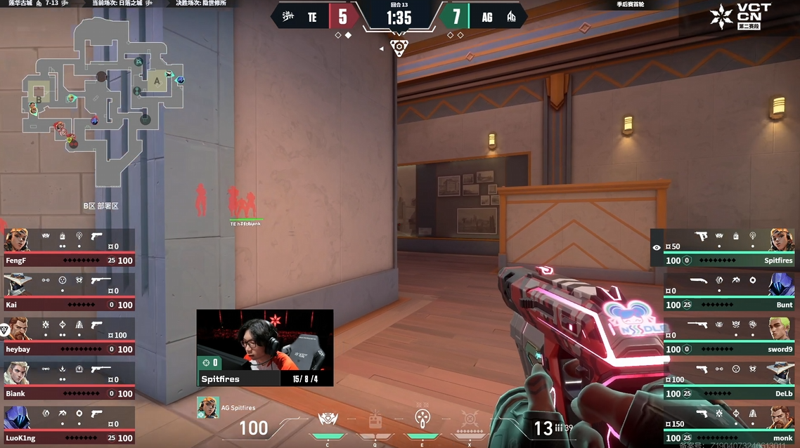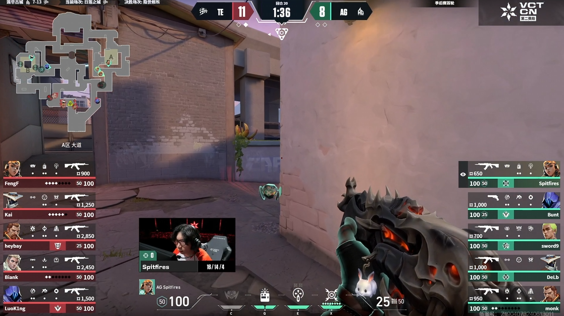 第20回合TE再次选择依靠终极技能提速B点单被遏制住第一波进攻,随后拉扯时间后BianK拿到击杀创造进点机会并配合队友拿到人数优势,Spitfires一打三残局被架住过点,TE拿到赛点,AG叫出暂停。