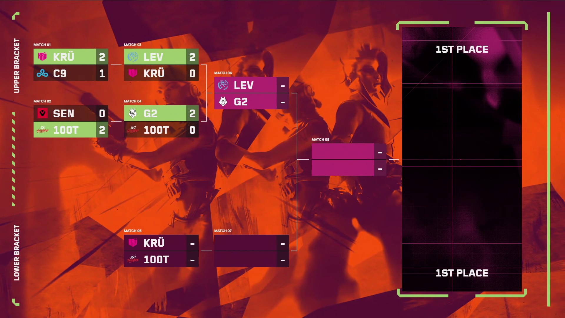 而KRU与100T则是被打入败者组,他们将于7月20日早上8点展开对决,胜者晋级败者组决赛。